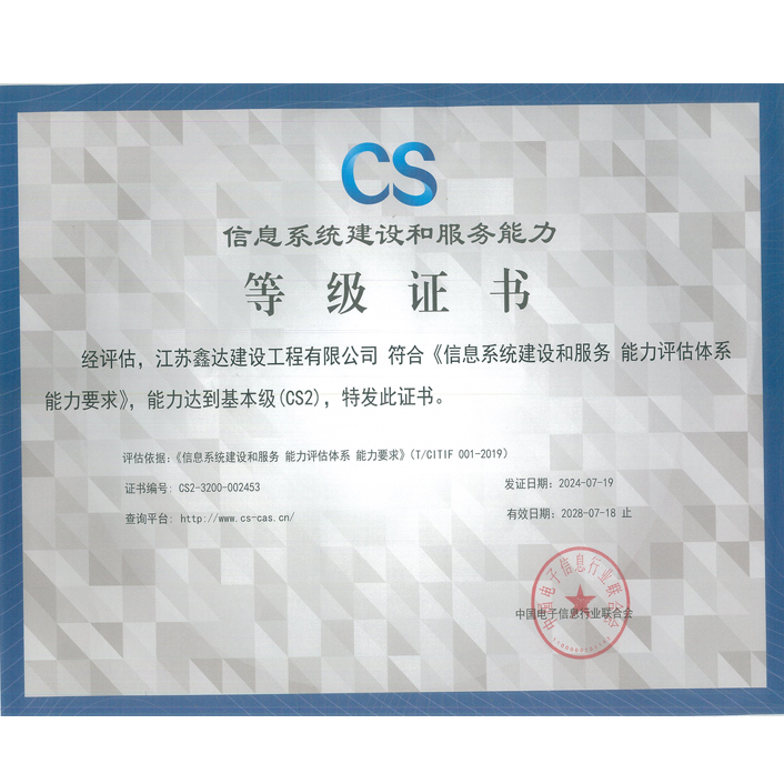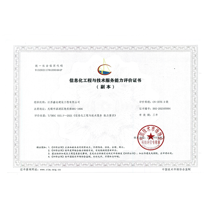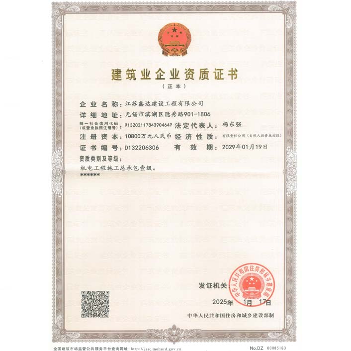 • 机电工程施工总承包壹级 • 电子与智能化工程专业承包壹级 • 建筑机电安装工程专业承包壹级 • 消防设施工程专业承包贰级 • 防水防腐保温工程专业承包贰级 • 建筑装修装饰工程专业承包贰级 |